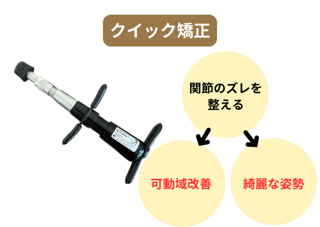 クイック矯正は、専用の器具「アクティベーター」を使い、身体の歪みや関節の動きの異常を正確に調整する手技療法です。手技で行う従来の矯正とは違い、微細な力で安全に骨格を整えるため、痛みの少ない施術が可能です。