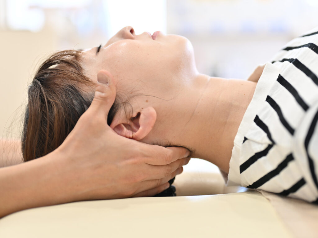 頭部~顔の筋肉をほぐし、リラックス効果、関節の動きが出やすいように調整します。